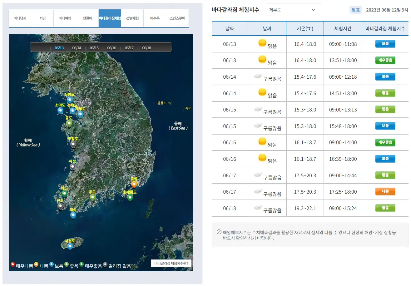 국립해양조사원은 제부도 포함 국내 14곳의 바다갈라짐 현상이 발생하는 곳을 종합하여 바다갈라짐 체험지수를 공개하고 있습니다.